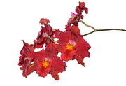 The striking flowers of this orchid feature velvety, ruffled crimson-red petals with bright yellow-orange centers. It blooms for an extended period, with multiple flowers on arching stems. As is common with hybrids, slight variations may occur between individual plants, with some displaying delicate white spots that add to the unique character of the cross.
