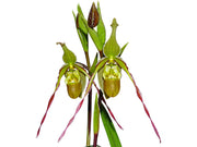 This terrestrial hybrid grows on the ground or rocks, producing long arching leaves and striking flowers with a unique pouch-like lip. It should be grown in a well-draining mix of fine bark and perlite with excellent drainage, and repotted every 1-2 years.