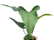 This is a cultivar of Anthurium sagittatum, a terrestrial and semi-epiphytic aroid native to Central and South America. It is distinguished by its large, arrow-shaped, glossy dark green leaves. The 'Purple' variation is noted for the intense purple color of its spadices and spathes, offering a distinctive ornamental appeal and an exotic appearance.