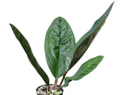 This distinctive Anthurium species displays exceptional large, oval-shaped foliage with prominent venation that creates a striking contrast between the glossy deep green upper surface and the distinctive bronze-purple coloration on the underside.