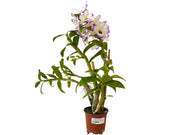 Features upright cane-like pseudobulbs with alternating leaves characteristic of Dendrobium hybrids. This hybrid blends traits from its parent plants, offering improved adaptability and the potential for striking blooms.