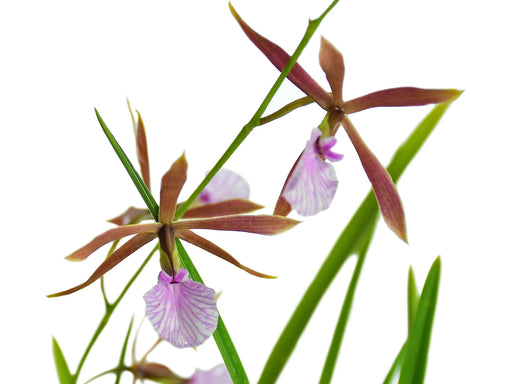 This captivating epiphytic orchid species is celebrated for its striking star-shaped flowers that display yellow-green petals with contrasting burg...