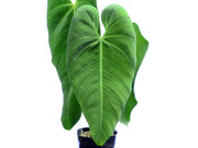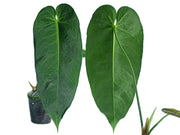 This is a large-sized plant, prized for its velvety, dark green leaves that have a luxurious texture and appearance. The leaves are typically heart-shaped with prominent, lighter-colored veins, adding to its ornamental appeal.