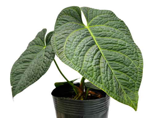 Anthurium Esmerald Beast Culture: This hybrid between Anthurium luxurians and Anthurium regale 'light' features large heart-shaped leaves with deep...