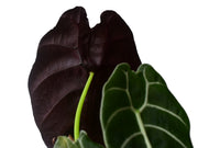 Known for its large, shield-shaped leaves that grow in an upright, clumping habit. The leaves are a glossy, deep forest green (sometimes with a velvety texture) and feature striking, silvery-white veins that create a bold contrast. The undersides of the leaves are often a rich dark purple or red.