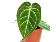 Anthurium Magnificent Girl is a unique hybrid of magnificum and besseae aff. It offers impressive heart-shaped leaves with a velvety texture and bold vein patterns, making it a prized choice for collectors.
