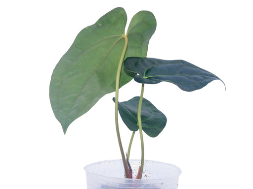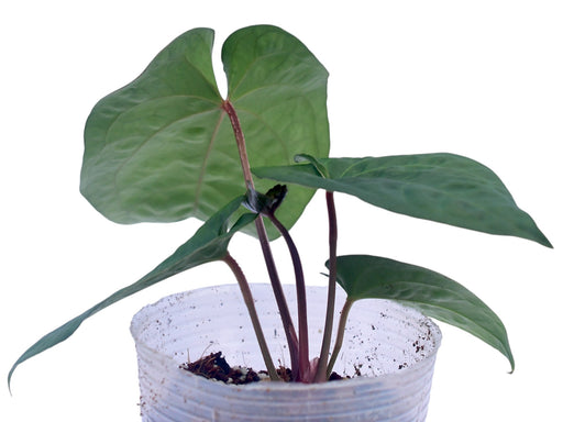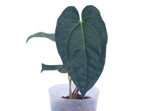 A stunning cultivar featuring large, velvety heart-shaped leaves in deep emerald green with striking burgundy-red petioles. This warm-growing aroid...