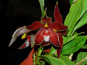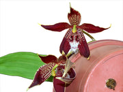 The broad, leathery leaves provide an attractive backdrop to the unique blooms. This species adds exotic beauty and sophistication to any orchid collection with its unusual flower structure.