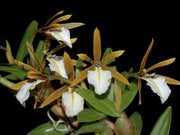 This captivating miniature orchid species is celebrated for its small clustered pseudobulbs and graceful arching stems that bear clusters of tiny star-shaped flowers in delicate shades of yellow and green.