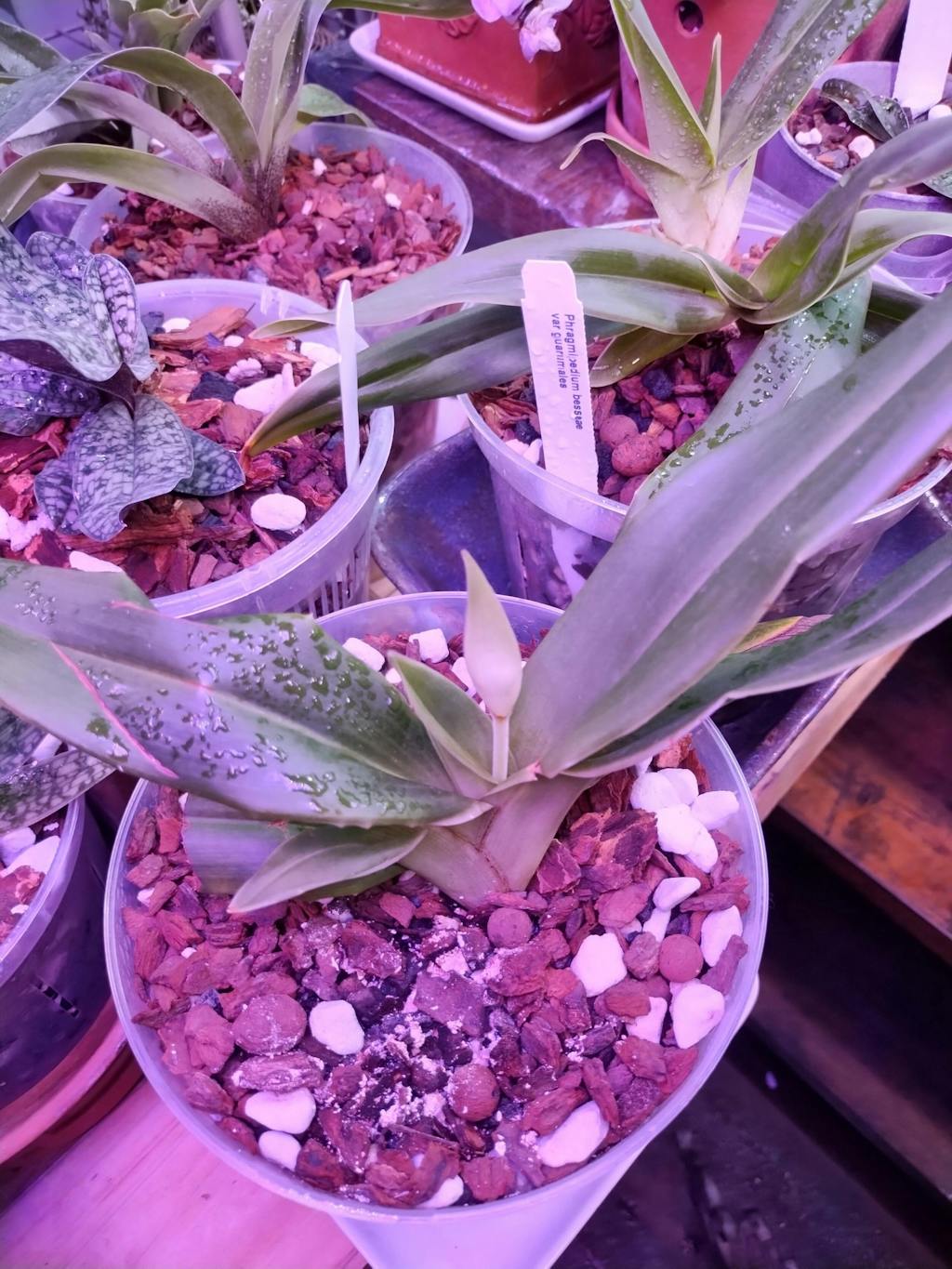 Another nice phrag with two established fans and good roots. Barely a pause before new roots popped out and plant began growing again.