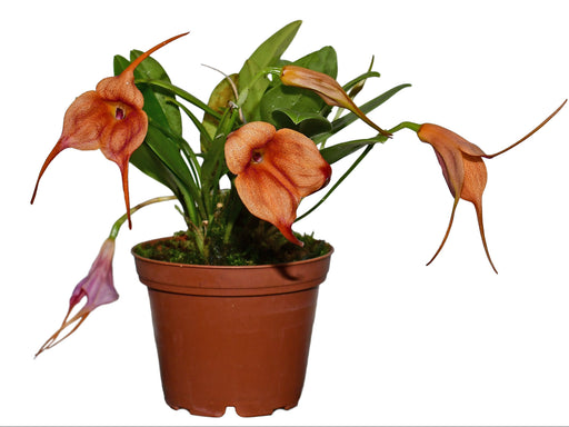 This primary hybrid combines Masd. veitchiana with Dracula Raven, producing vibrant orange-red flowers with a distinctive tubular shape and dramati...