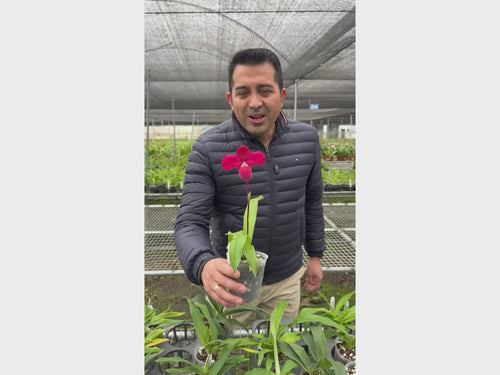 Produce stunning flowers with vibrant colors ranging from deep magenta to rich burgundy, often with darker veining inherited from kovachii. The substantial blooms feature a prominent pouch and well-proportioned petals, blooming sequentially on strong stems for extended flowering periods.