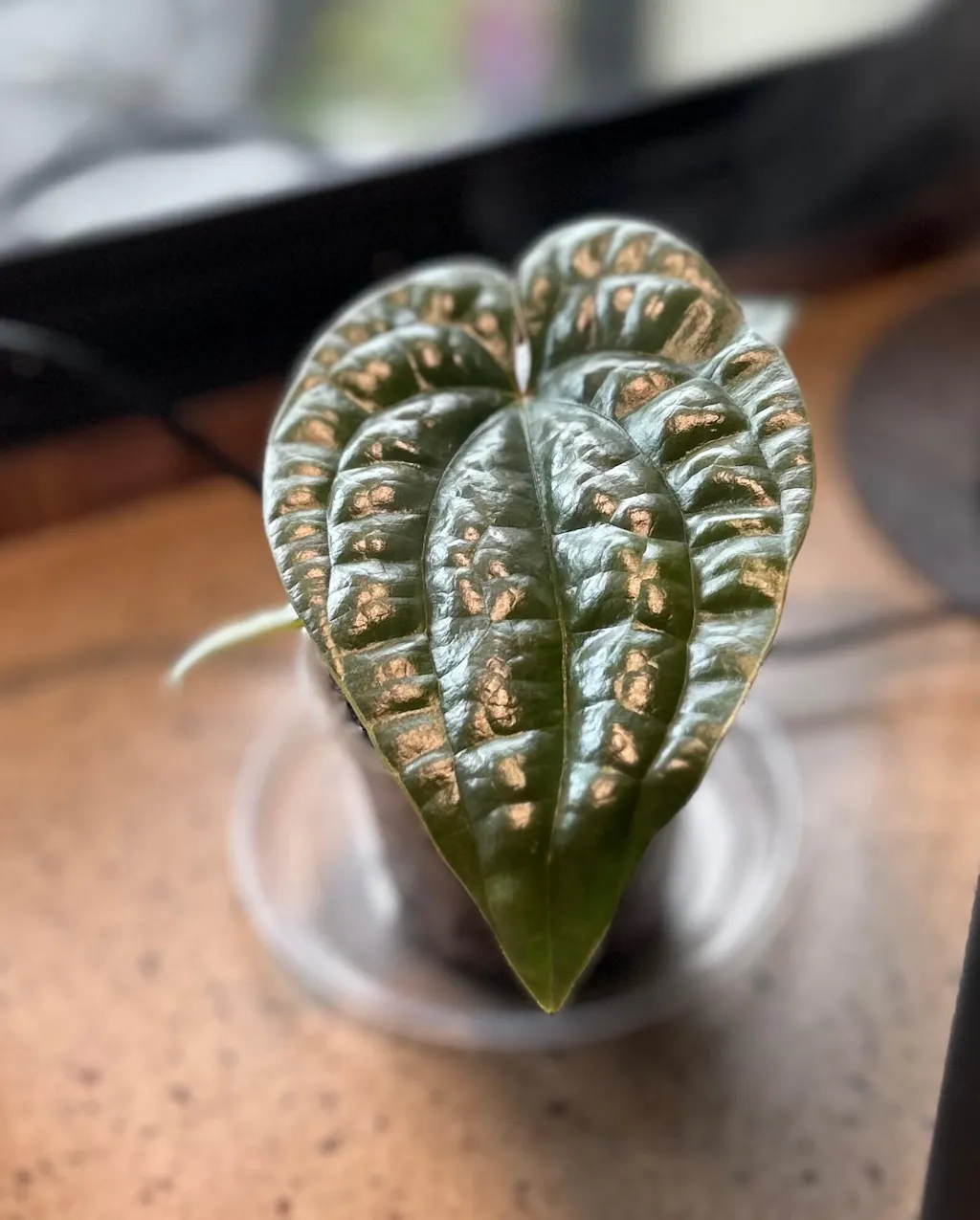 Anthurium luxurians features large, heart-shaped leaves with deeply quilted texture, dark green upper surfaces, and striking burgundy-red undersides. Its dramatic color contrast and bold textured appearance make it a prized choice for collectors.