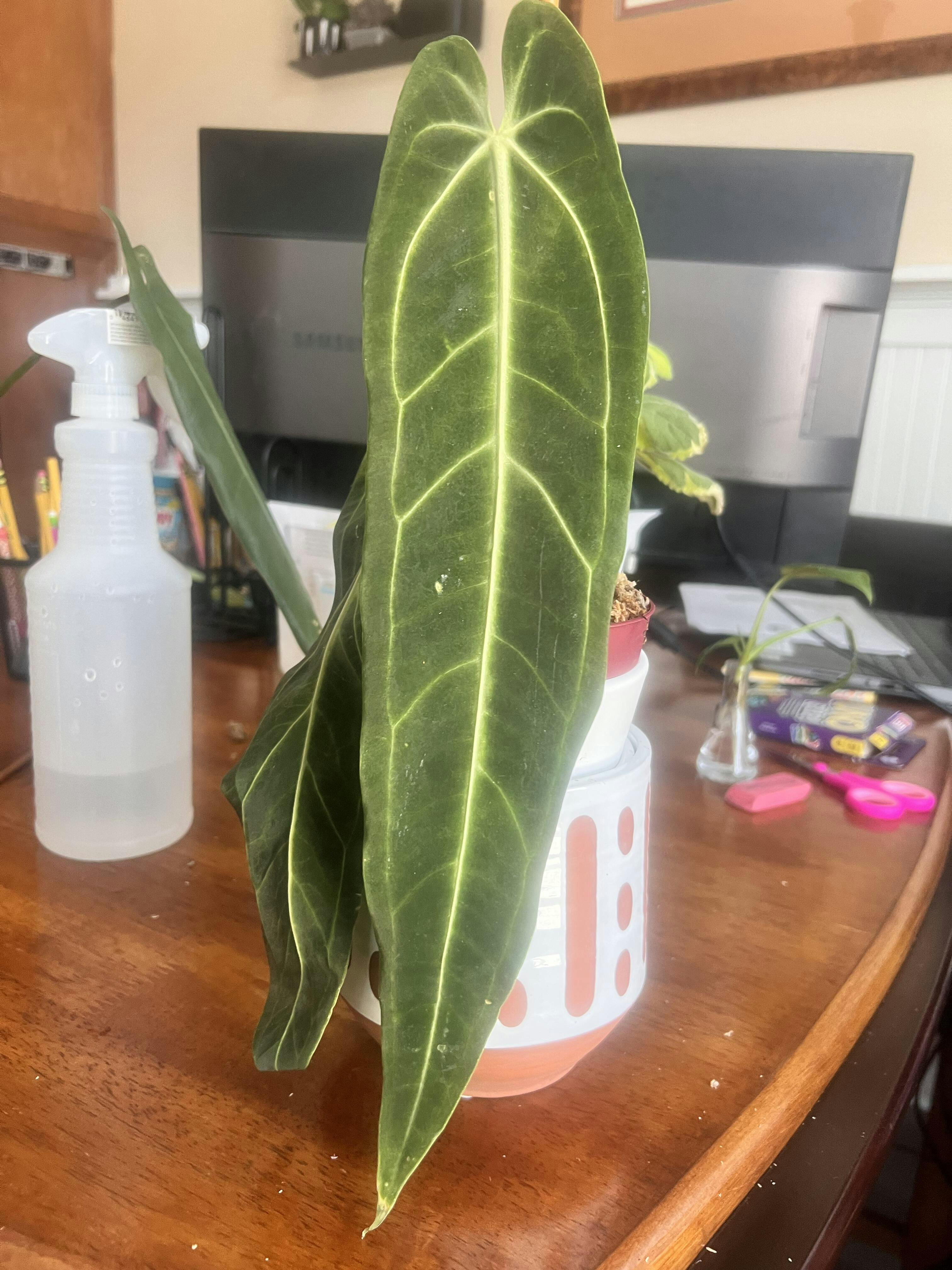 The leaves of mature specimens can become impressively long and may need gentle vertical support. Like all Anthuriums, this plant is considered toxic if ingested by humans or pets.