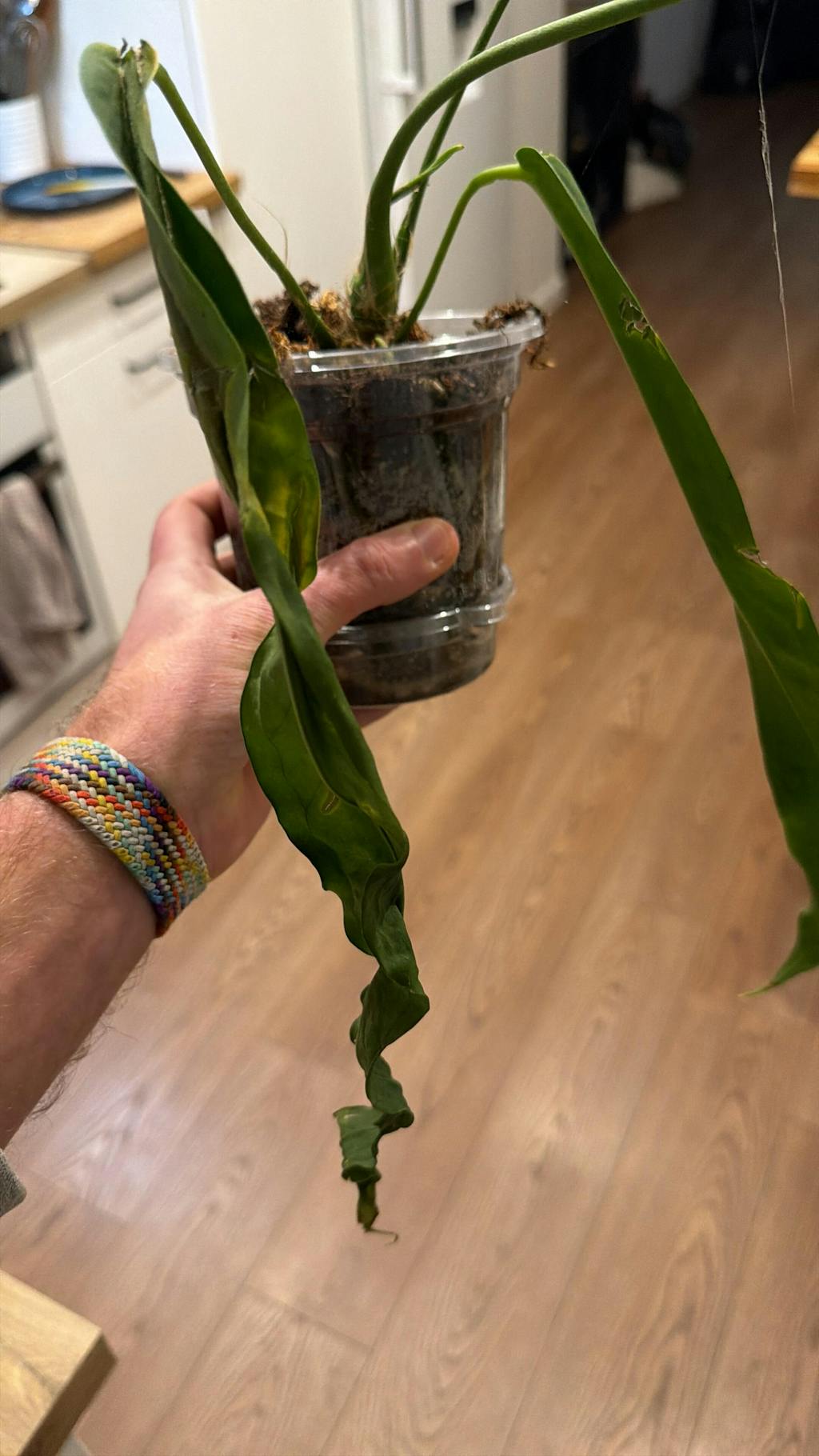 Ordered for pick up at event. Plant came with 3 basically undamaged leaves, (only superficial scuffing on one of the leaves). Much bigger than I expected! Each leaf is longer than my forearm.